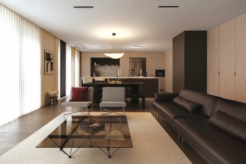 주방의 아일랜드는 공간의 중심축으로 자리하며, 결이 도드라진 세라믹 상판은 측면까지 이어져 안정감을 선사한다. 여기에 주방 전면의 수납장은 벽체와 동일한 톤으로 마감해 빌트인 가전까지 하나의 면처럼 보이도록 했다. 반면 거실은 최소한의 가구와 장식으로 시선을 정리하고, 그레이 유리 테이블과 스테인리스 상판의 반사를 통해 공간의 깊이감을 확장했다.