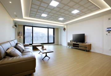 미가 프레임월로 포인트를 준 거실 천정은 가히 독특하고 고급스러운 분위기를 풍긴다. 간접등과 매입등을 활용하여 조도를 확보했으며, 동시에 돌출 없는 광원으로 본연의 디자인 콘셉트인 ‘심플함’을 잘 살려냈다. 거실 아트월은 미가 600평판으로 제작하였으며, 거실 기둥과 벽면 하단은 자연의 느낌을 그대로 표현한 화이트 컬러의 미가 루버를 계획해 자칫 밋밋할 수 있는 벽면에 입체감을 주고 클래식함을 더했다.